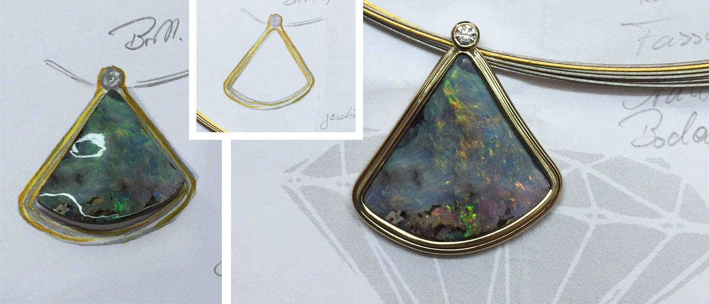 Wir entwerfen für Sie und mit Ihnen zusammen Ihren individuellen Schmuck und fertigen diesen dann für Sie in unserer Goldschmiedewerkstatt. Dabei skizzieren wir zunächst für Sie verschiedene Entwürfe. Wir können aus einer Fülle aus Edelsteinen den passenden Stein für Sie suchen und haben verschiedenste Edelmetalle zur Ansicht da. Wir beraten Sie zu den verschiedenen Möglichkeiten, Fertigungstechniken, Fassarten bis hin zur individuell gestalteten Oberfläche. Ebenso erarbeiten wir einen Kostenvoranschlag für Sie.